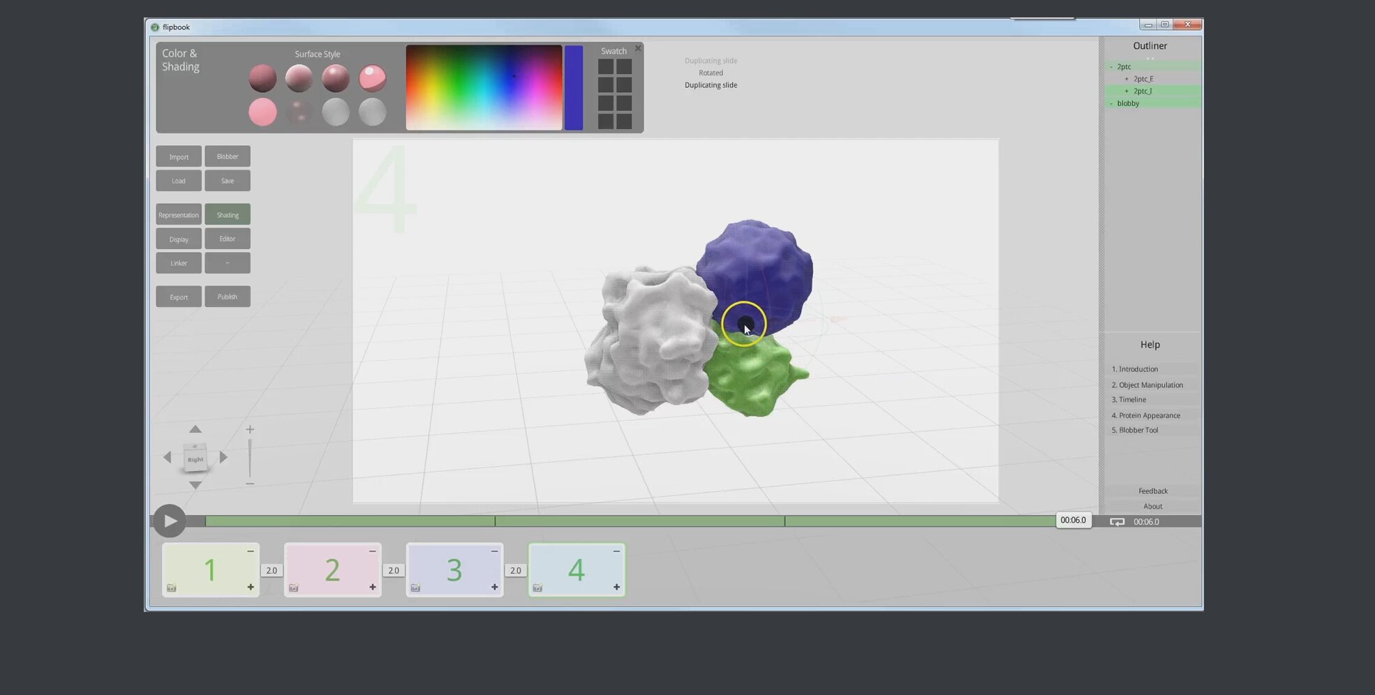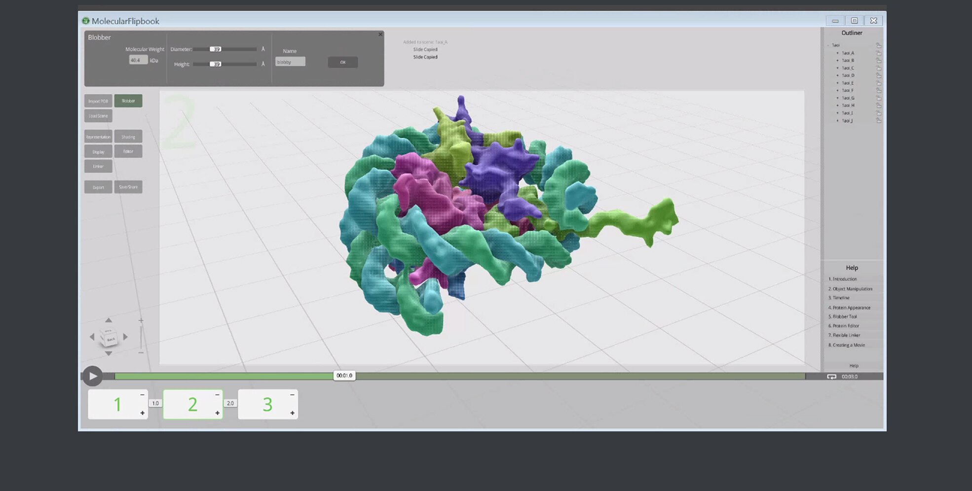 Molecular FLipbook is a free and open-source molecular animation program. The animation toolkit is based on the GPL-license Blender Game Engine.