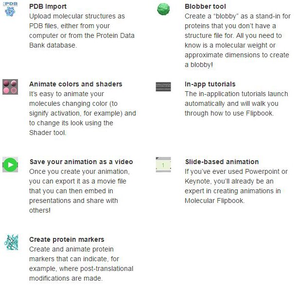 Molecular FLipbook is a free and open-source molecular animation program. The animation toolkit is based on the GPL-license Blender Game Engine.